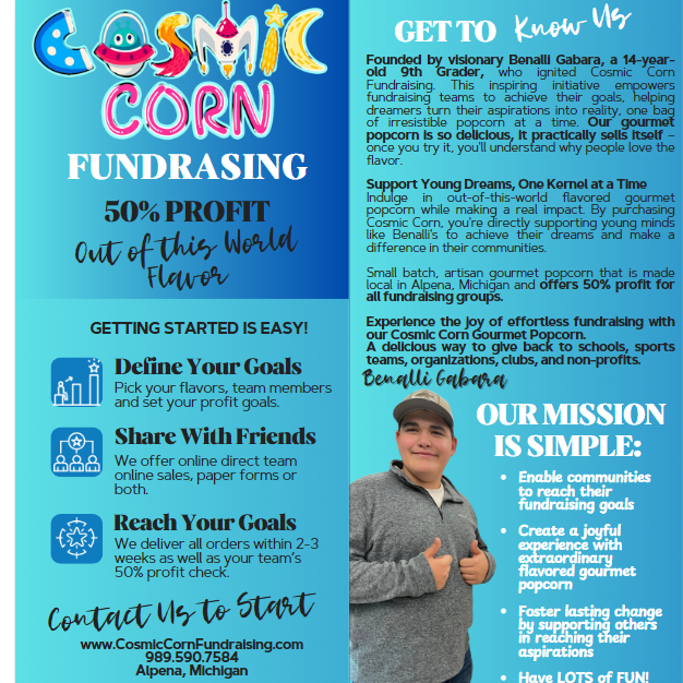 Fundraising with delicious gourmet popcorn has never been easier or more delicious to help your organization, sports team, non-profit or group reach their goals. Cosmic Corn prides itself on small batch artisan gourmet popcorn made in Michigan and is ran by a 9th grader, Benalli Gabara. He believes in giving back to his community and fellow youth who want to reach their goals.